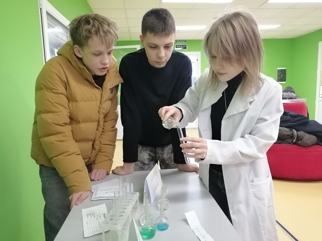 А от на зупинці “Цікава хімія” учасників чекало експериментальне завдання — приготувати розчин заданого складу з використанням запропонованих реактивів. Тут важливими були точність, уважність і вміння працювати злагоджено.